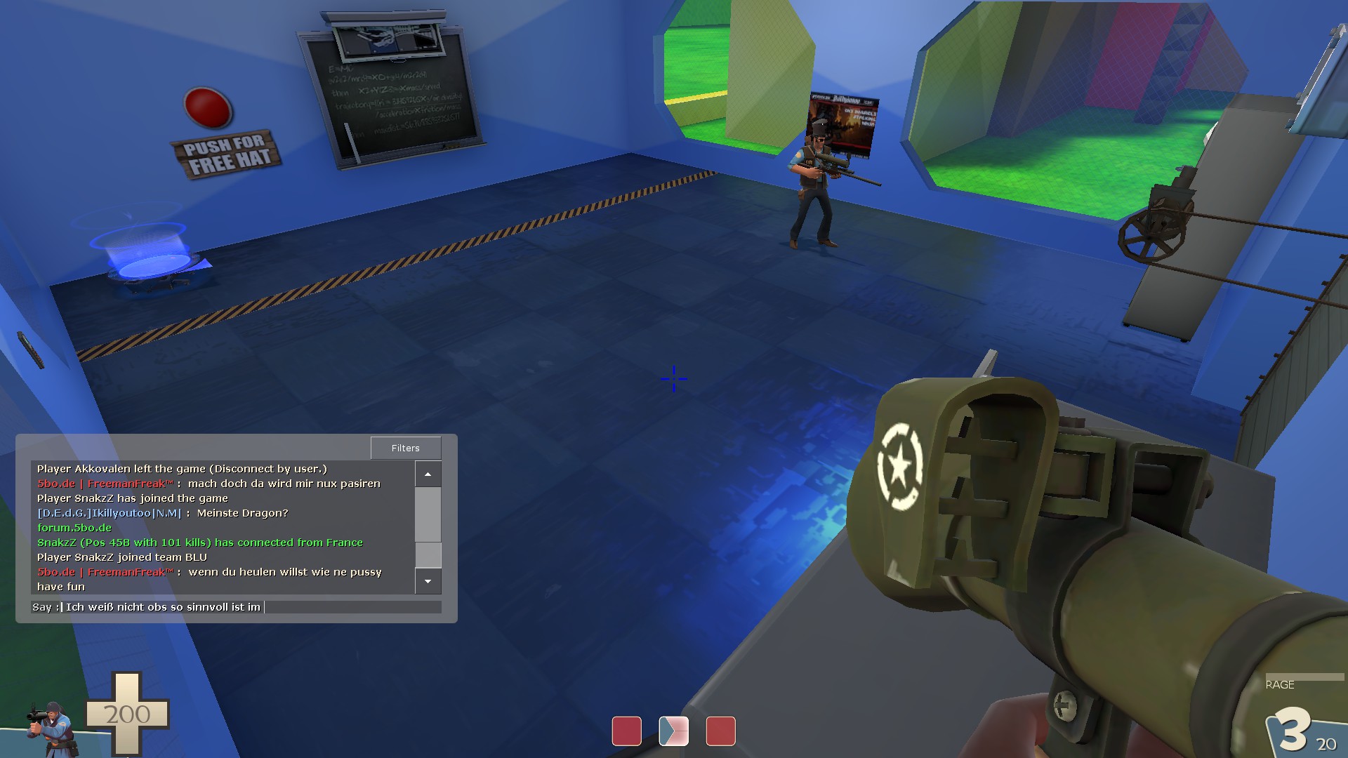 Ich hatte ja schon 1-2 Admins ge-addet, musste aber warten bis meine Anfrage angenommen wurde. Also spielte ich einfach etwas weiter um meinen Frust etwas abzubauen. Dabei hab ich auch reichlich die Taste G benutzt bei kills (in TF2). Da fiel mir noch ein das DayDreamer gesagt hatte, er wäre im TS mit Freeman, also trat ich auch dem TS bei, um zu hören was die so miteinander sagten. Nebenbei waren einige andere Leute im selben channel, mitunter Dragonrider (er war auch auf dem selben server). Ich hab zwar keine Aufnahmen (deshalb will ich mich nicht so viel darauf stützen), aber neben gelästere über den DEdG clan, sagte Freeman, als ich ihn getauntet hatte, er würde mich bannen. Es gab 'ne kurze Diskussion was für nen Ban. Jemand fragte "Wochenban?" darauf kam die Antwort "Permaban". Dragonrider unterstützte ihn dabei mit der Meinung "mir reichts auch mit ihm". Als Grund dachte sich Freeman "Provokation". Also wurde ich auch kurz darauf aus dem Server geworfen, mit jeweiligem Grund im Sourceban. Aber wie gesagt, besitze ich dafür keine Aufnahme, es sind keine 1:1 Zitate und ich verstehe es auch wenn ihr mir das nicht glaubt.