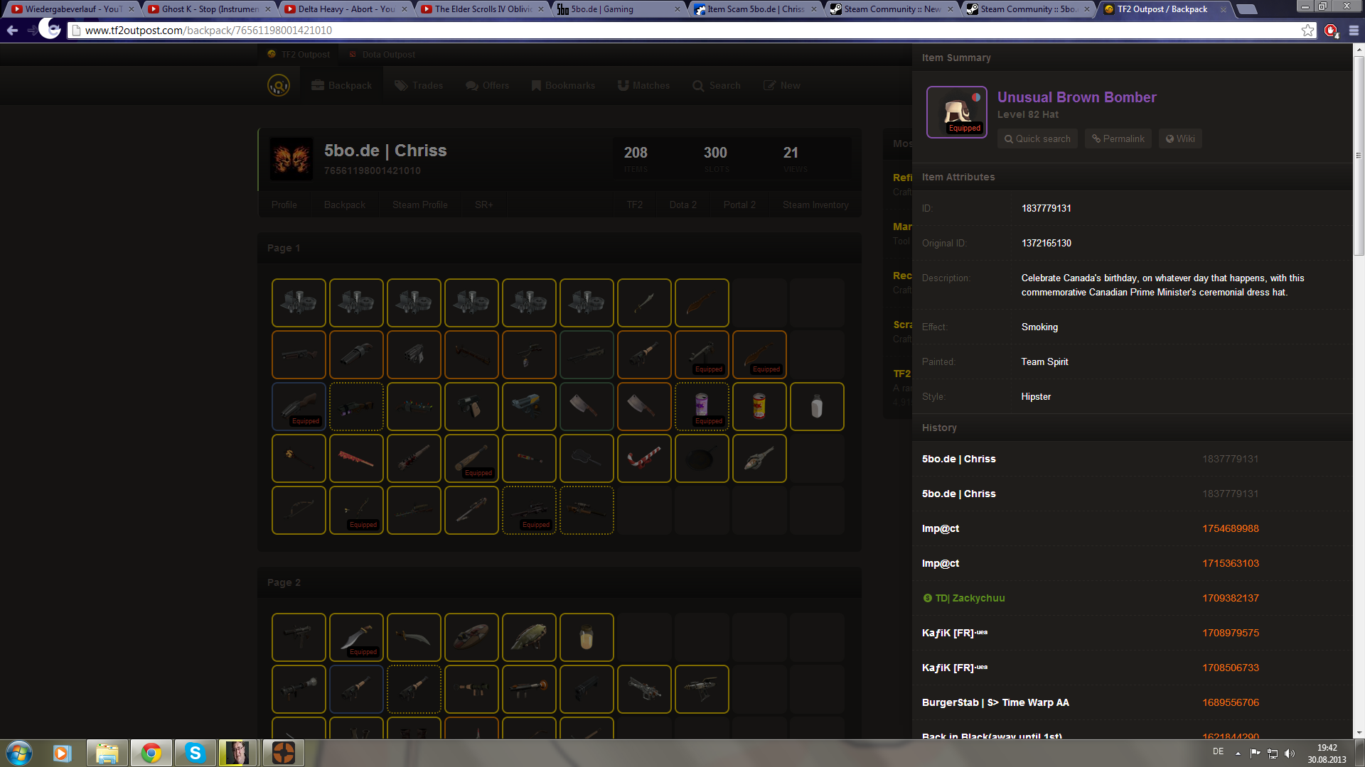 Ich bin zwar kein Member, eurer Community jedoch würde ich gerne einen Item Scam melden. Dieser bezieht sich auf 5bo.de | Chriss. Impact verlieh im guten vertrauen vor dem Urlaub seinen Unusual Brown Bomber an Chriss mit der Bedingung diesen nach Ende des Urlaubs zurückzugeben. Dies ist bis heute nicht geschehen und mit eigenen Worten von Chriss wird das auch nicht passieren. Somit ist dies ein Scam.