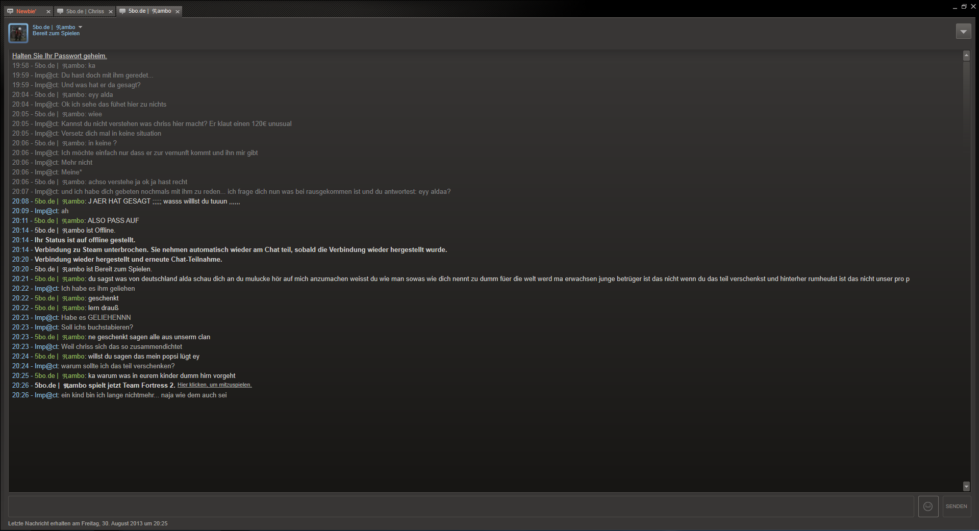 Als ehrliche Community sollte man dagegen etwas unternehmen, sollte dies alles nichts bringen würde ich Chriss auch bei steamrep melden. Beweise haben Impact und ich zu genüge.Freitag, 30. August 2013