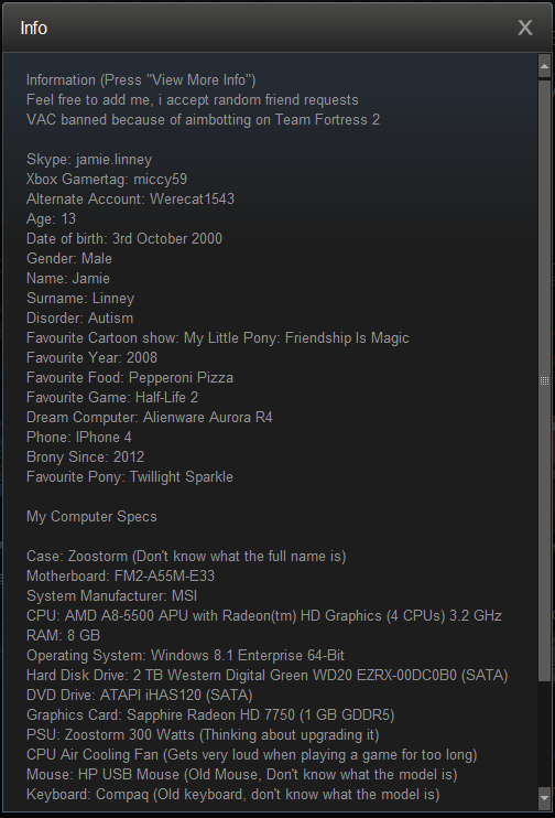 STEAM_0:1:40277360 (his main, notice that he admits to hacking in the description)
